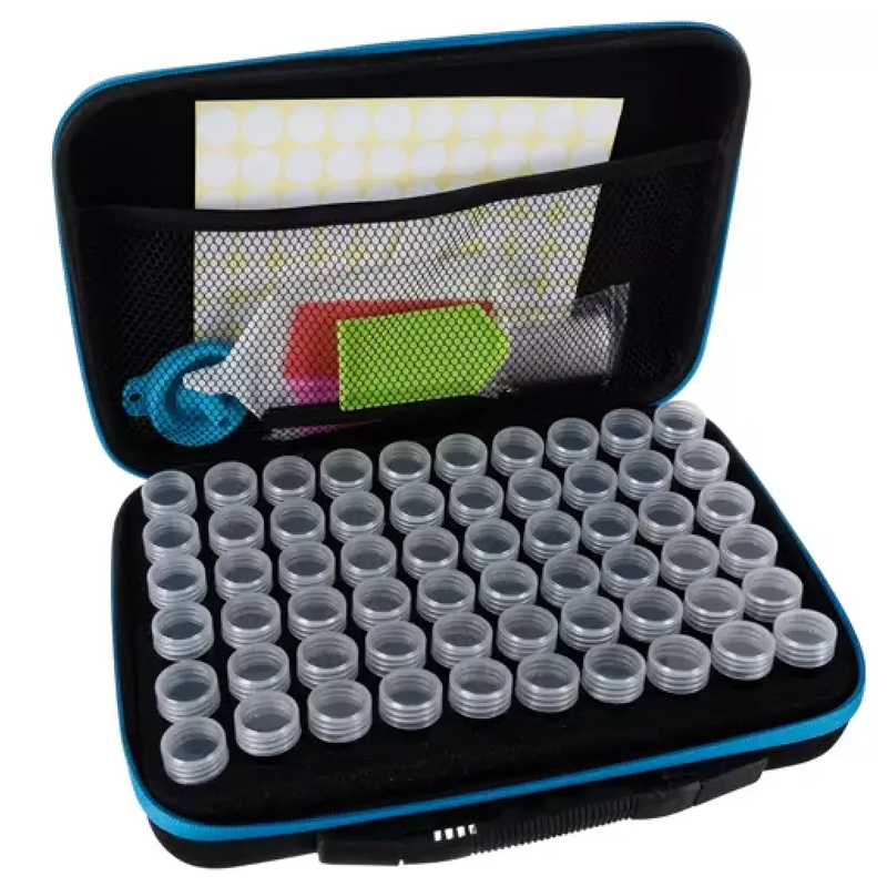 Fantastisk taske med ekstra Diamond Paint indholdMed denne taske har du mulighed for, at have styr på alt dit Diamond Paint grej. Tasken er kommer med intet mindre end 60 bøtter med skruelåg. Hvor du har mulighed for, at opbevare dine perler. Derudover får