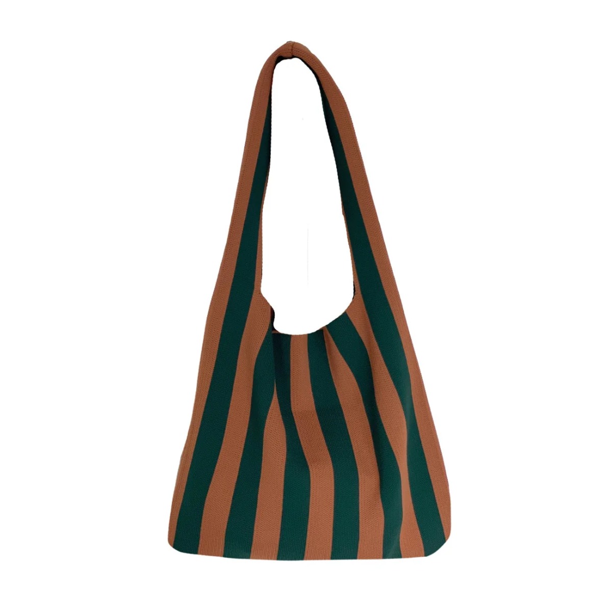 Lækker taske fra By Stær med brune og flaskegrønne striber. Tasken har en god. Stor rummelighed som er perfekt til alle hverdagens småting og kan bæres over skulderen. OBS. Grundet den strikkede kvalitet. Kan tasken ikke holde til tung vægt.
