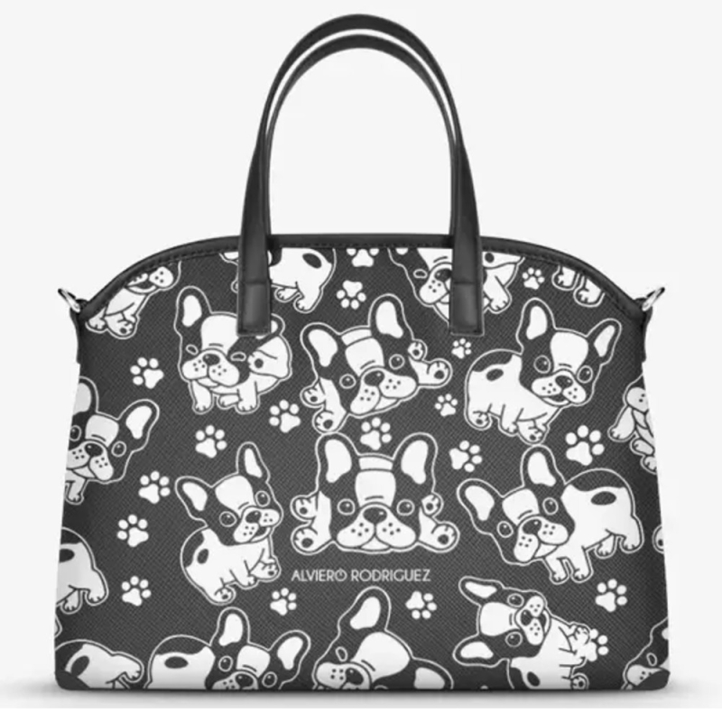 Sort taske med Franske bulldogs. NbspRummelig taske med håndtag. Lavet i fake skind. Taske består af et stort indvendigt rum med en mindre sidelomme. Begge rum lukkes med lynlås. Der medfølger aftagelig skulderrem. Mål. 34 x 25 x 14 cm. Designet